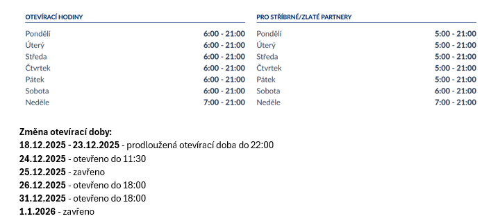 Na všech našich 13 pobočkách je běžná otevírací doba od pondělí do soboty od 6:00 do 21:00. V neděli pak od 7:00 do 21:00. Běžnou otevírací dobu si můžete ověřit zde.